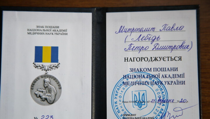 The abbot of the Holy Dormition Kyiv-Pechersk Lavra, Metropolitan Pavel of Vyshhorod and Chernobyl, was awarded a medal of the National Academy of Medical Sciences of Ukraine, reports the Lavra’s press service on September 25, 2020.