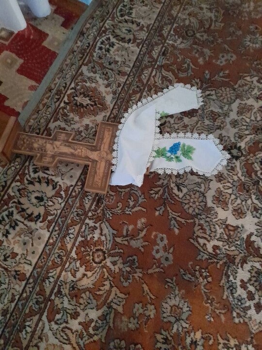 "Attackers smashed the windows in the house, took away candles, scattered them in the yard, overturned everything in the room, spilt an unknown liquid on the throne, stole wine, and urinated on the priest's vestments," says the message.