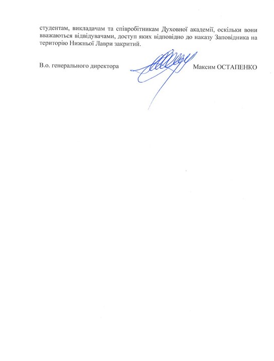 “The Reserve and the Theological Academy do not have contractual relations regarding the activities of the Theological Academy on the territory and in the buildings of the Lower Lavra, as well as regarding the stay of its students, teachers, and employees there,” the letter says. “In view of the foregoing, the Reserve cannot give permission to students, teachers, and employees of the Theological Academy, since they are considered visitors, whose access to the territory of the Lower Lavra is closed according to the order of the Reserve.”