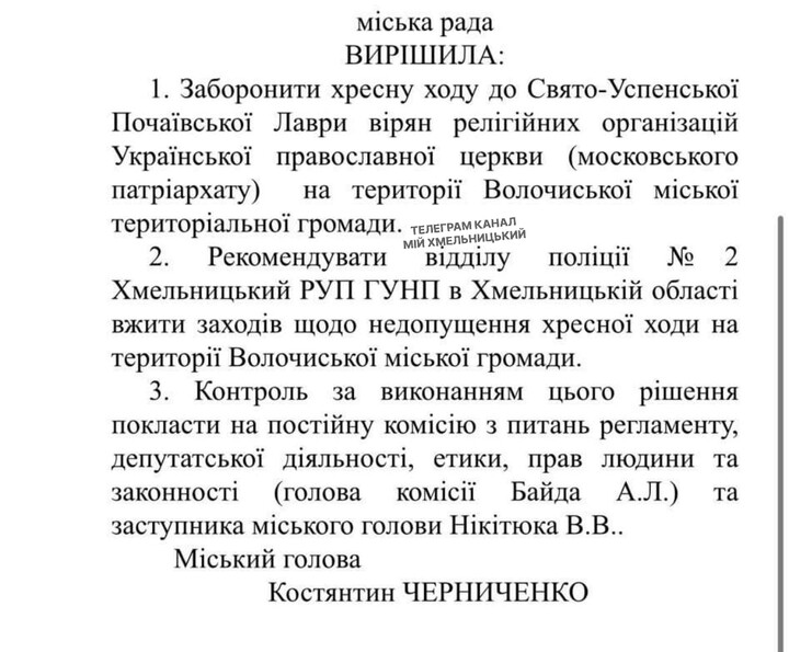 On August 21, 2023, the Volochysk City Council of the Khmelnytskyi region prohibited believers of the UOC, who are participating in a religious procession to the Pochaiv Lavra, from passing through the settlements of the Volochysk territorial community, reports the press service of the mayor’s office.