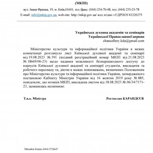 In response, the acting Minister of Culture, R. Karandeyev, directed a letter to the Lavra on August 17, 2023, where teachers, students, and staff of the Kyiv theological schools are equated with visitors of the Lavra, and access to the monastery's territory and buildings of the Academy is prohibited.