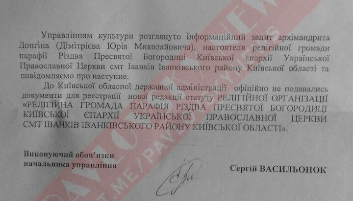 According to the resource, a message appeared on the website of the Kyiv regional administration that UOC believers from Ivankiv allegedly submitted documents to re-register their religious community. At the same time, neither any of the members of the community nor the rector submitted any documents to the Regional State Administration and were not going to transfer to the OCU.