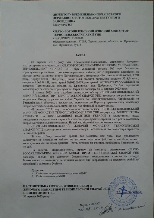 The Abbess, Mother Dimitriya, addressed a letter to the director of the Kremenets Reserve, V. Mikulich, informing that the monastery had contacted the Ministry of Culture and the State Property Fund requesting an extension of the contract. She urges the Reserve not to take any eviction actions until a response is received.