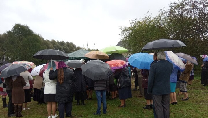 Having lost its church, the UOC community in Zabolotsi prays in the rector's yard. Photo: UOJ Having lost its church, the UOC community in Zabolotsi prays in the rector's yard. Photo: UOJ