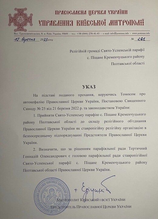 On September 12, 2023, Epifaniy Dumenko “accepted” the Assumption Parish of the Ukrainian Orthodox Church in the village of Pishchane, Poltava region, into the OCU as his “stauropegia”. As the “head of the parish council” Hennadii Tertychny wrote on Facebook, Dumenko handed him the corresponding decree at his residence.