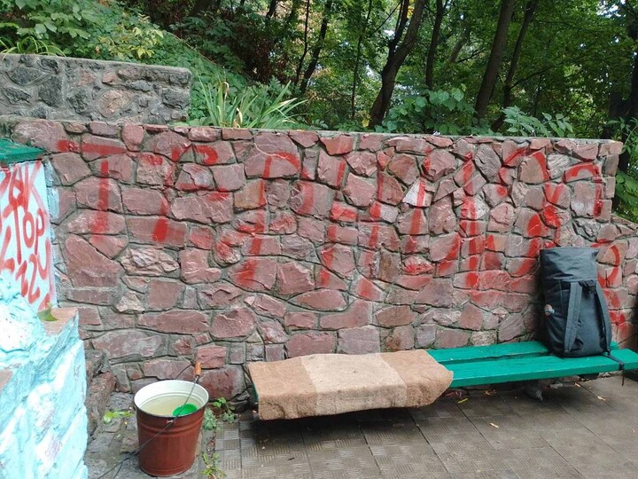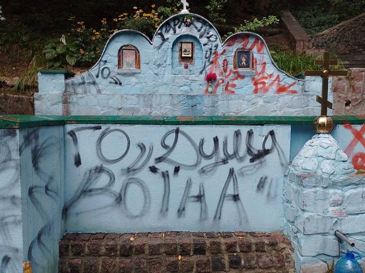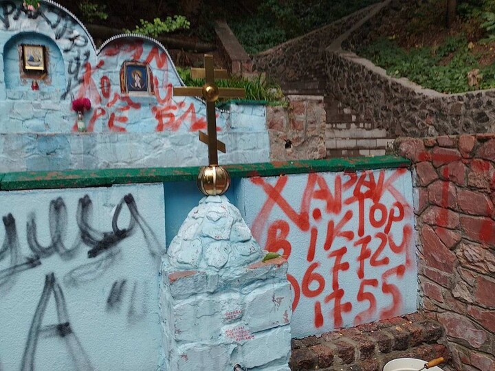 Attackers desecrated the Lavra chapel, leaving inscriptions on it with paint.