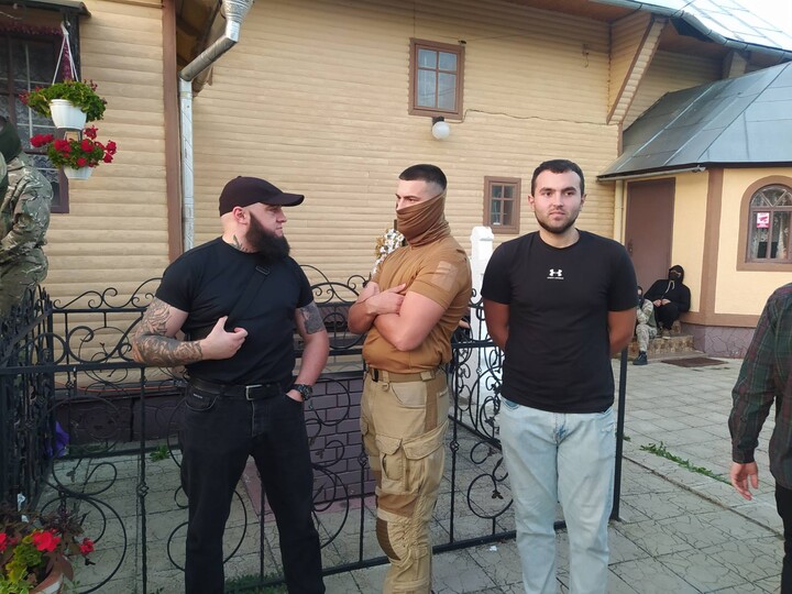 “Titushki” and police officers at the entrance to the UOC temple in the village of Stara Zhadova. Photo: facebook.com/orthobuk “Titushki” and police officers at the entrance to the UOC temple in the village of Stara Zhadova. Photo: facebook.com/orthobuk