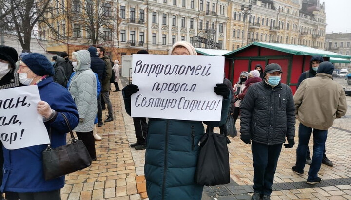 Dozens of people, indignant at the actions of Patriarch Bartholomew, gathered in Sophia Square in Kyiv.