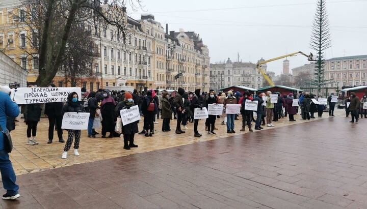The protesters are holding posters on which you can read the following words: “Bartholomew – get out of Ukraine”, “Zelensky sold the Church to a Turkish priest”, “Bartholomew sold Hagia Sophia” and others.