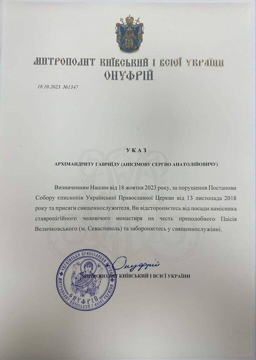 His Beatitude Metropolitan Onuphry of Kyiv and All Ukraine has removed Archimandrite Gabriel (Anisimov) from his position as the superior of the Stavropegial Monastery in Sevastopol and prohibited him from performing priestly duties. This decision is outlined in a decree issued by the Primate of the Ukrainian Orthodox Church (UOC) on October 18, 2023, raskolam.net reports.