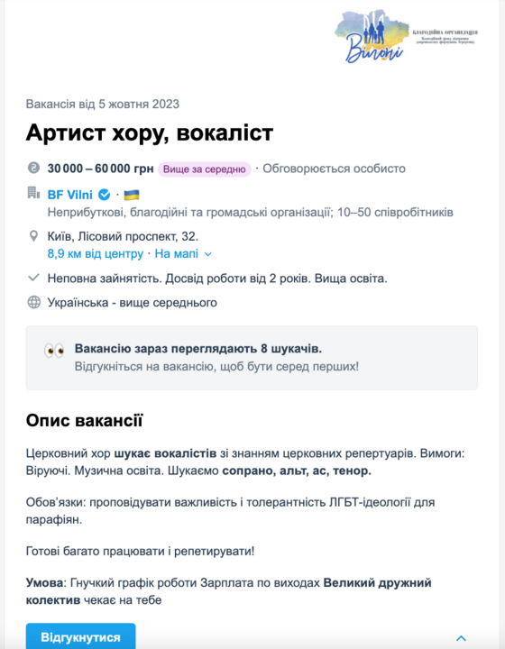 The “Vilni” Charitable Fund has placed an advert on the Work.ua website with a job offer for vocalists to preach LGBT ideology among parishioners. Both male and female voices are being recruited.