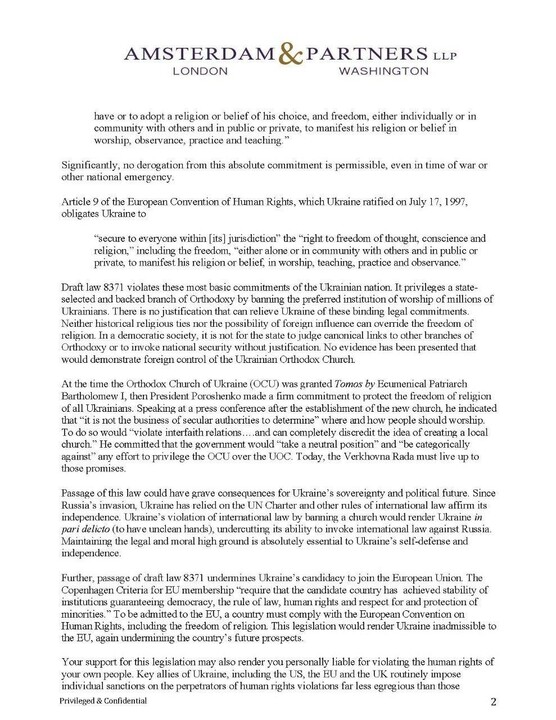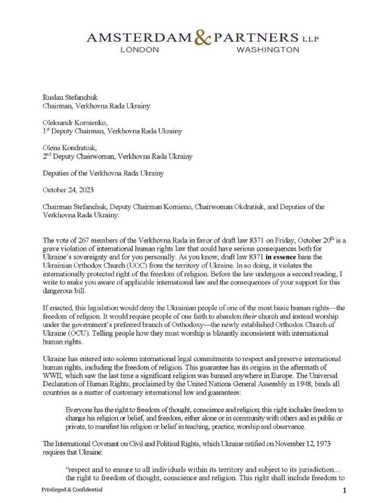 The vote of 267 members of the Verkhovna Rada in favor of draft law 8371 on Friday, October 20th is a grave violation of international human rights law that could have serious consequences both for Ukraine’s sovereignty and for you personally. As you know, draft law 8371 in essence bans the Ukrainian Orthodox Church (UOC) from the territory of Ukraine. In so doing, it violates the internationally protected right of the freedom of religion. Before the law undergoes a second reading, I write to make you aware of applicable international law and the consequences of your support for this dangerous bill.