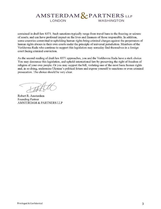 As the second reading of draft law 8371 approaches, you and the Verkhovna Rada have a stark choice. You may denounce this legislation, and uphold international law by preserving the right of freedom of religion of your own people. Or you may support the bill, violating one of the most basic human rights and, in so doing, undermine Ukraine's political future and expose yourself to sanctions or even criminal prosecution. The choice should be very clear.