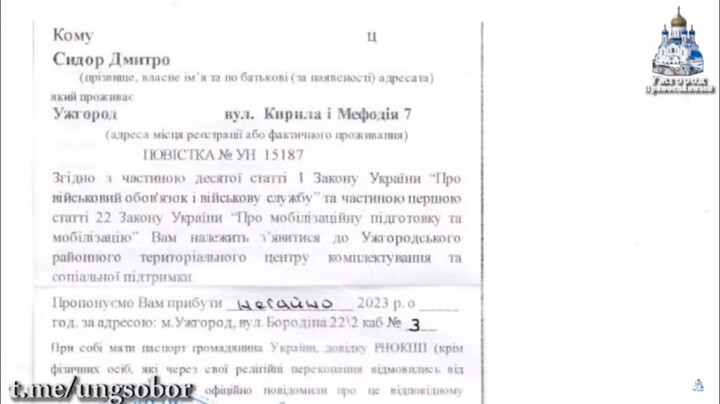 Archpriest Dimitriy Sydor, 69, rector of the Holy Cross Cathedral of the Ukrainian Orthodox Church in Uzhhorod, received a summons to the army, according to which he must "immediately" report to the local military recruitment centre. He said this during a sermon published on the cathedral's YouTube channel.