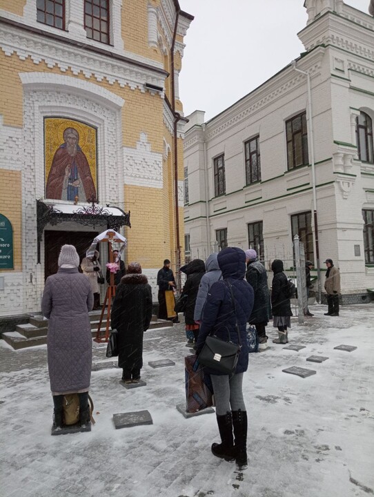 Despite the cold and snow, several dozen UOC believers gathered near the Kiev Pechersk Lavra to continue their prayer in defense of the monastery.