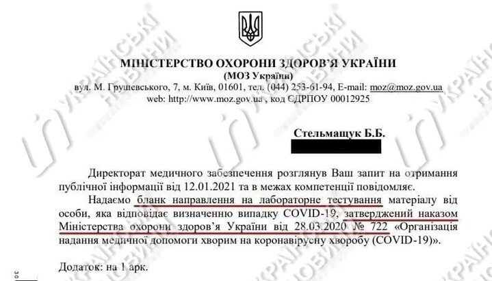 The authority specified in its reply to the news agency's request that the form was approved by the Order of the Ministry of Healthcare No.722 dd. 28.03.2020 "Organization of medical care for patients with coronavirus disease (COVID-19)".
