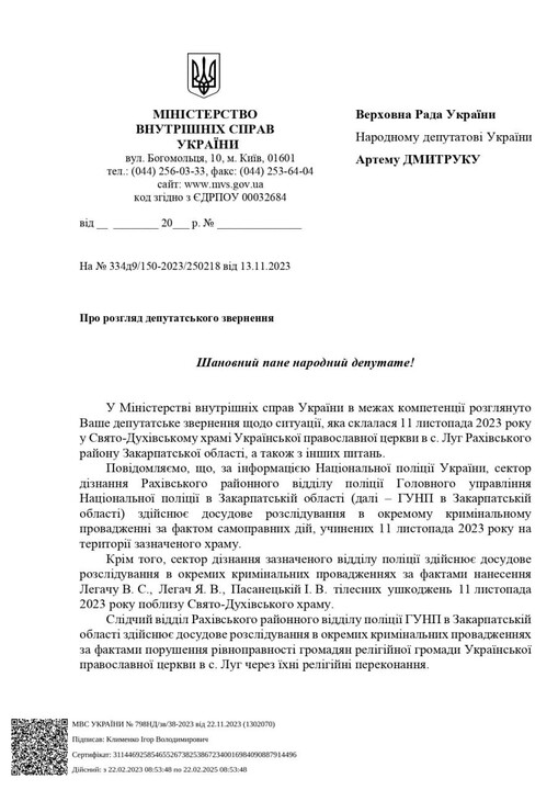 Ukraine's Minister of Internal Affairs, Iрor Klymenko, announced the initiation of several criminal cases after representatives of a private security company attacked a pregnant parishioner, worshippers, and a UOC priest during the forceful seizure of the Holy Spirit Church in the village of Luh in the Zakarpattia region. MP Artem Dmytruk reported this in his Telegram channel.