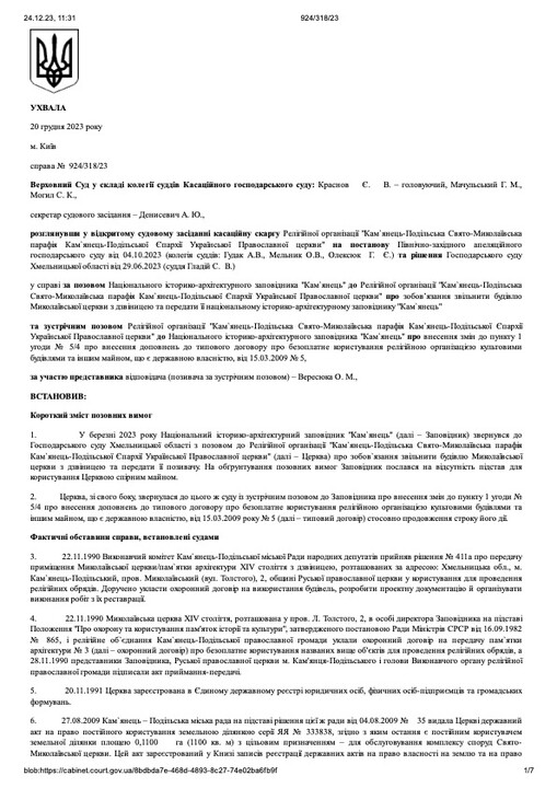 Archpriest Oleksiy Veresiuk told the UOJ correspondent that after the Supreme Court of Ukraine cancelled the decision of the Khmelnytsky Region Economic Court of 29 June 2023 to evict the St. Nicholas community of the UOC in Kamyanets-Podilskyi from the St. Nicholas Church and transfer the church to the local Reserve "Kamyanets", representatives of the executive service, together with the director of the Reserve, came to the church.