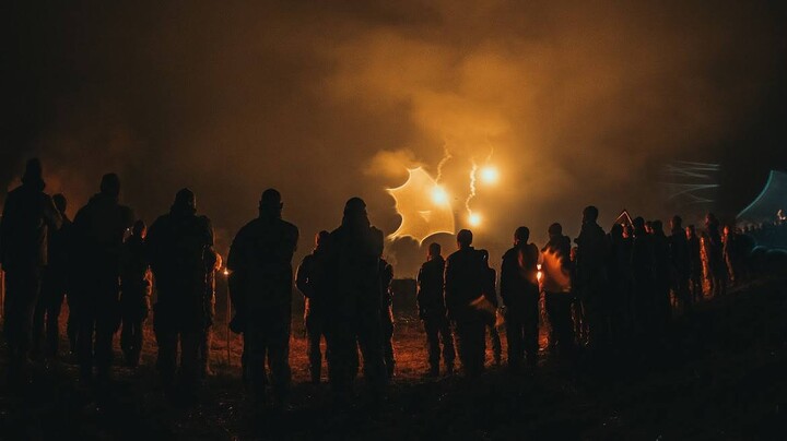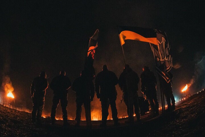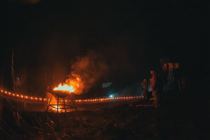 The published photos show several dozen people in military uniforms with torches in their hands standing in front of a lit bonfire and a cauldron.