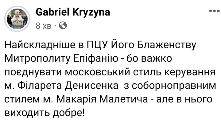 "It is most difficult for His Beatitude Metropolitan Epifaniy – because it is challenging to combine Moscow-style management of Metropolitan Filaret Denisenko with the conciliar style of Metropolitan Makariy Maletich – but he manages to do it successfully," Kryzyna quipped.