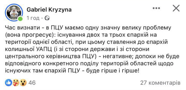 In one of his posts, Kryzyna pointed out a "big problem that is progressing" – the existence of two or three eparchies in one territory.