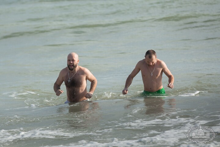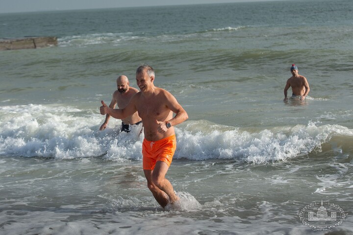 After the consecration of water, Odesa residents took part in the traditional baptismal bathing in the Black Sea. In total, several dozen believers of the UOC took a dip in the font.