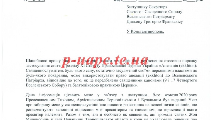 Roman Budzinsky wrote a letter addressed to the Deputy Secretary of the Holy Synod of the Patriarchate of Constantinople, Deacon Gregory Frankakis (now he became the General Secretary of the Synod – Ed.), in which he asked to explain to him the application procedure set out Article 2, Section XI of the OCU Statute, which says that “a priest of any rank, ultimately condemned by his ecclesiastical authorities to any punishment, can use the right of appeal to the Ecumenical Patriarch, in accordance with the provisions of the sacred canons (9 and 17 of the Fourth Ecumenical Council) and the centuries-old practice of the Church."