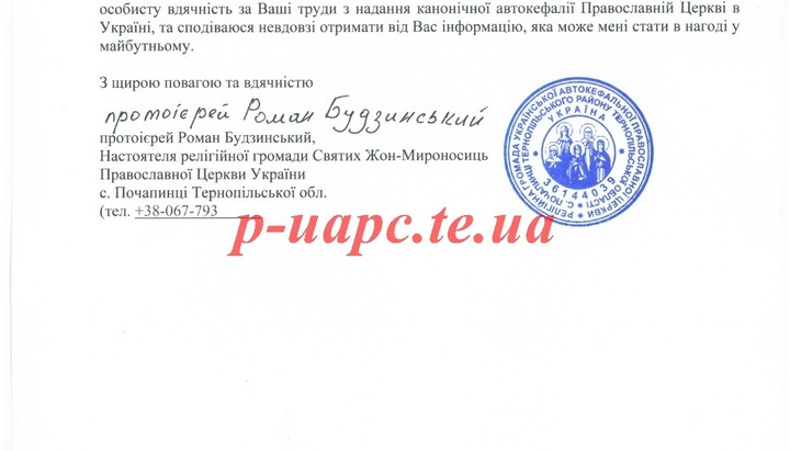 Roman Budzinsky stressed that neither he personally “nor the community of the Holy Myrrh bearers in Pochapyntsi village, Ternopil region, never made a decision to join the jurisdiction of the Ternopil-Buchach diocese of the OCU”.
