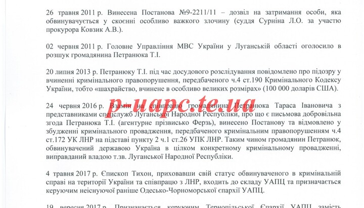 The publication also said that Tikhon Petranyuk left his wife and 7-year-old daughter and in 2009 became a “bishop” of the UOC-KP, but due to financial fraud he was banned from “priesthood” by Filaret's “synod”. Later, he migrated to the UAOC and was subsequently admitted to the “hierarchy” of the OCU.