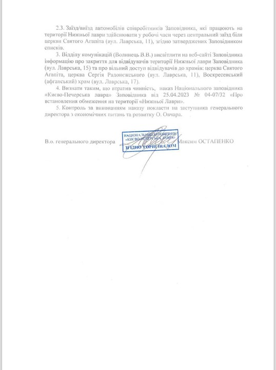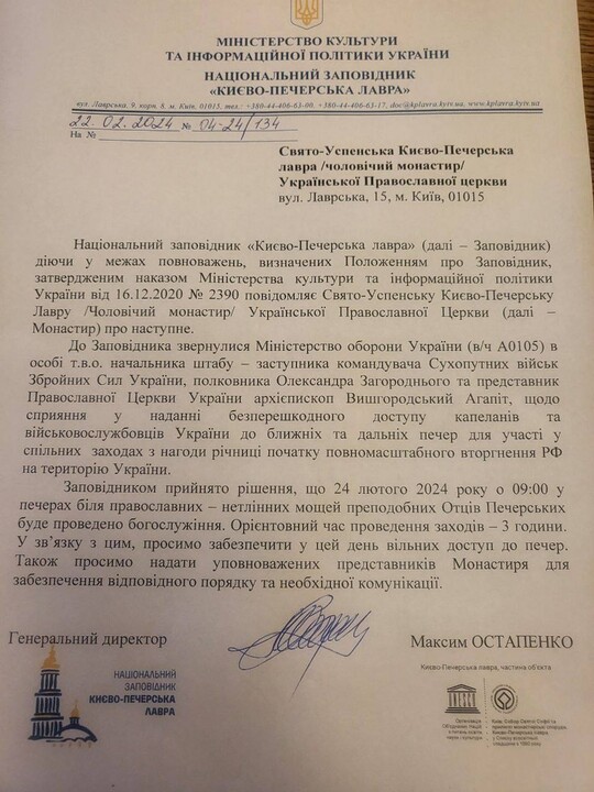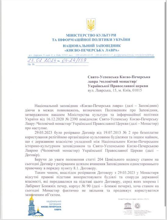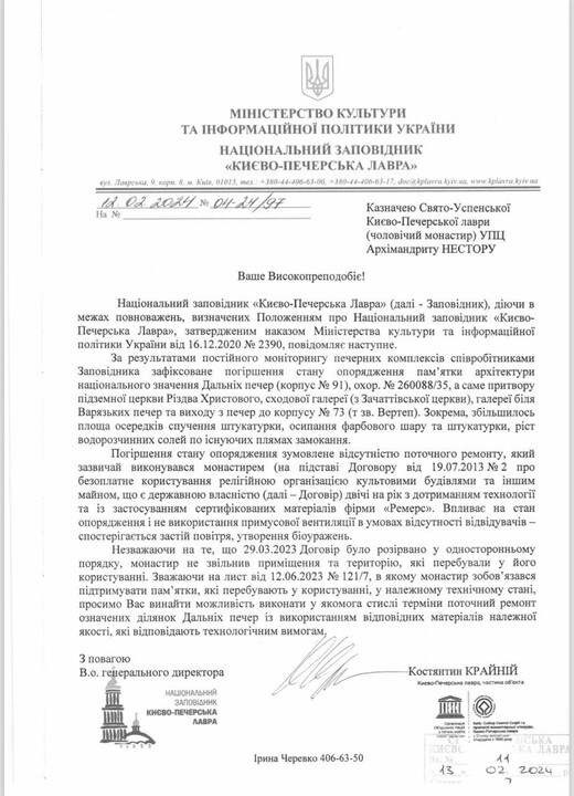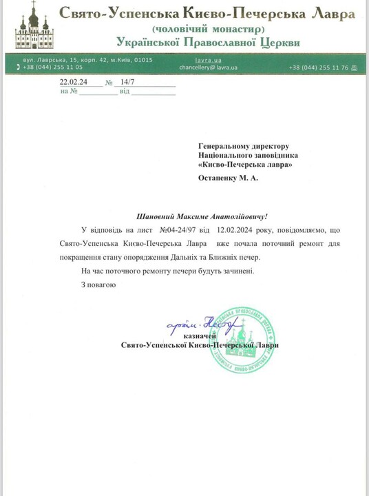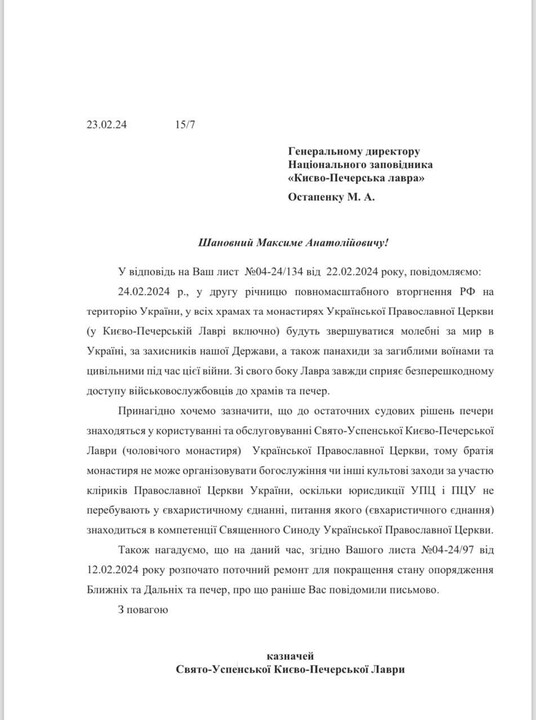 He said the monastery received such a letter after refusing to facilitate a "worship service" of the OCU in the Near Caves on 24 February 2024, which was to be attended by "Archbishop Agapit of Vyshhorod" of the OCU. The lawyer attached the monastery's correspondence with the Reserve, in which the monks explained that such a "divine service" was impossible for two reasons. The first is that the UOC and the OCU are not in eucharistic communion. The second is that the monastery is carrying out repairs in the caves, which the monks are doing at the request of the Reserve itself.