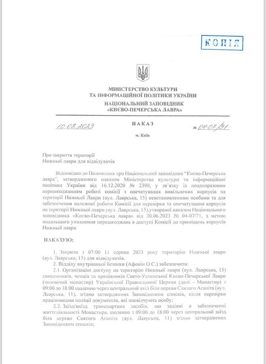 "There is no limit to the cynicism and blatant manipulation of the Reserve representatives and some religious organisations," the lawyer wrote. “First of all, we would like to remind the public that according to the Reserve's Order N 04-07/91 of 10.08.2023, from 7:00 a.m. on 11 August 2023, access to the territory of the Lower Lavra was closed to visitors. Subsequently, the Reserve requests in writing the Monastery to carry out repair work in the caves. The Monastery agrees (despite everything), informs the representatives of the Reserve also in the form of correspondence about it and starts repair works. And then suddenly come representatives of the most patriotic religious organisation in Ukraine (who never manipulate on the sorrow of war), and demand to open the caves, in which repair works are already being carried out (about which they are probably "allegedly" unaware), to accuse of non-admission and obstruction... Coincidence? No, we don't think so!".