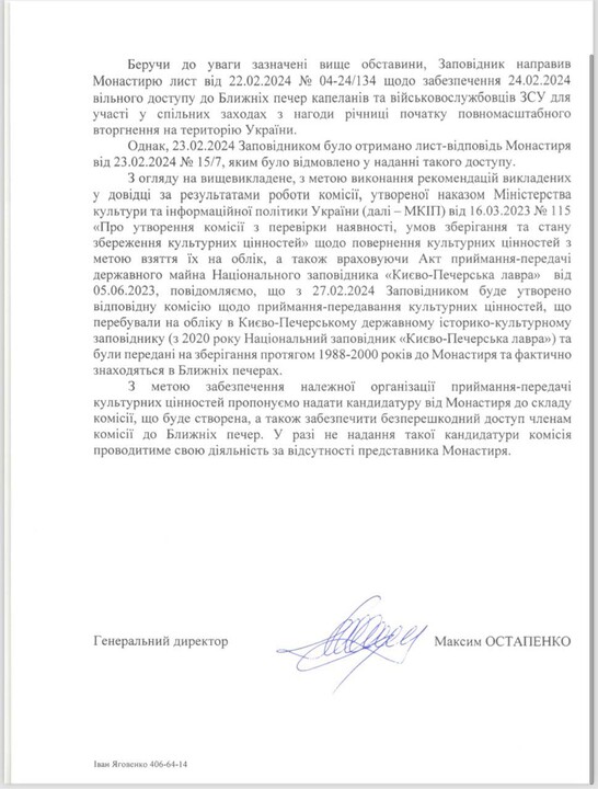The head of the Kyiv-Pechersk Lavra Reserve Maksym Ostapenko said in a letter to the monastery that from 27 February a commission on "the return of cultural values to have them listed" will start working in the Near Caves, reports the Lavra's lawyer Archpriest Nikita Chekman on his Telegram channel.