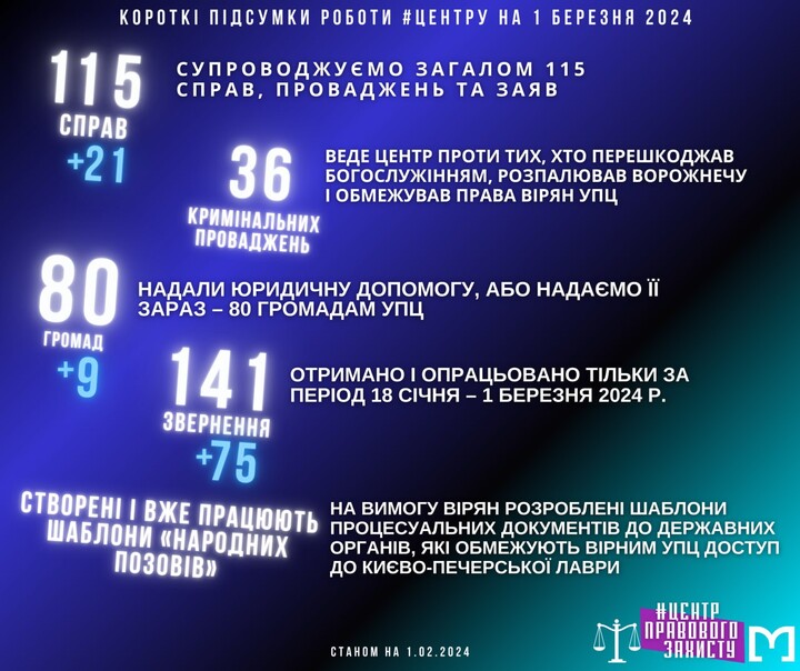 The Legal Defence Centre of the UOC was established in January 2024. As of March 1, it is handling 115 cases, proceedings, and applications, reports the Telegram channel "Myriany" (“Laity”).