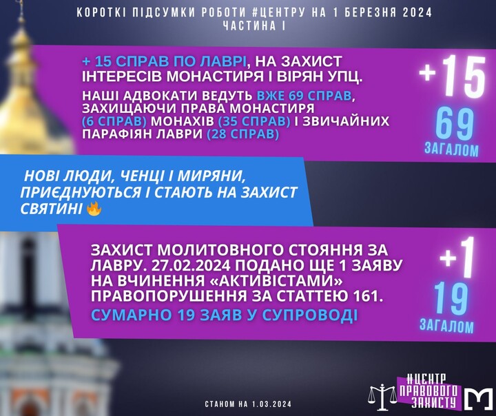 Lawyers are handling 69 cases, defending the rights of the monastery and believers, including 6 involving monks and 35 involving parishioners. They are also supporting 19 proceedings related to "activists" committing offences during prayer vigils (under Article 161 of the Criminal Code of Ukraine on the violation of citizens' equality based on their religious beliefs).
