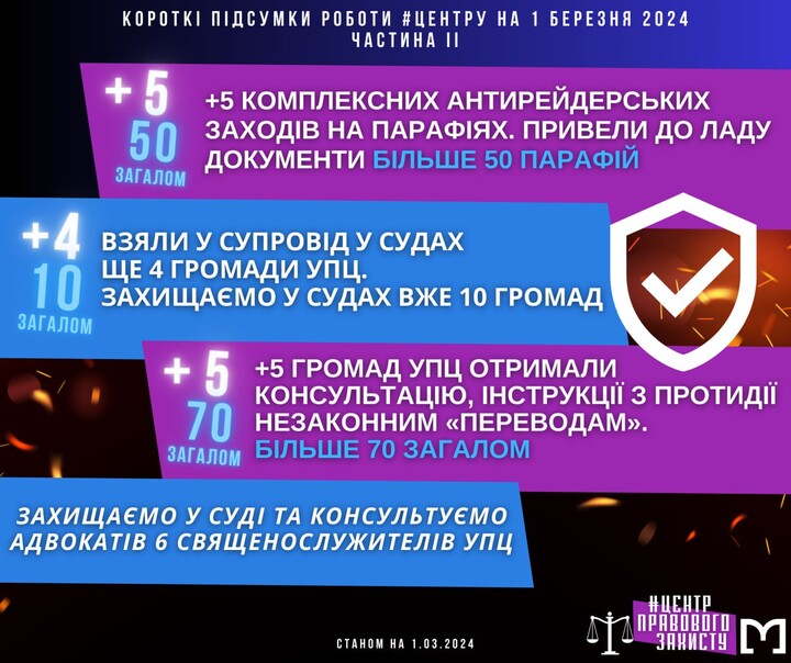 According to human rights activists, this period has been characterized by "painstaking legal work, consultations, meetings, court sessions, documenting crimes and immediate assistance to those communities and faithful of the UOC who need it urgently."
