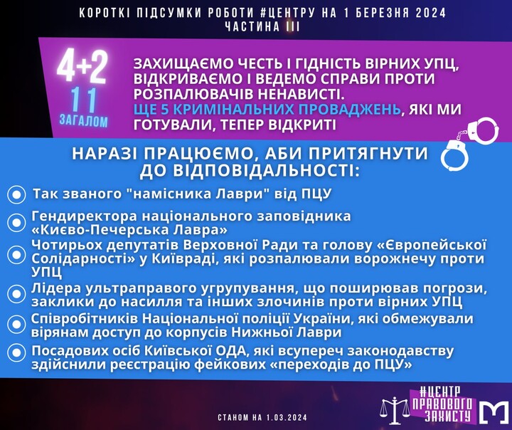 The Centre is handling 36 criminal cases against those who obstructed worship, incited hatred and restricted the rights of UOC believers.