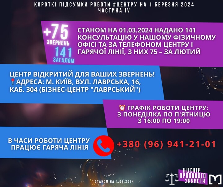 Assistance can be sought at the address: Kyiv, 16 Lavrska Street, office 304. (Lavrsky Business Centre) Monday to Friday from 16:00 to 19:00. Consultations are available during the Centre's working hours at +380 (96) 941 21 01.
