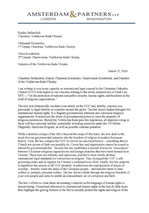 On March 15, 2024, in light of ongoing persecutions against the Church and the government's desire to adopt criminal law 8371, Robert Amsterdam wrote an appeal to the speaker of parliament, Ruslan Stefanchuk, and Ukrainian MPs, the Politika Strany Telegram channel reports.