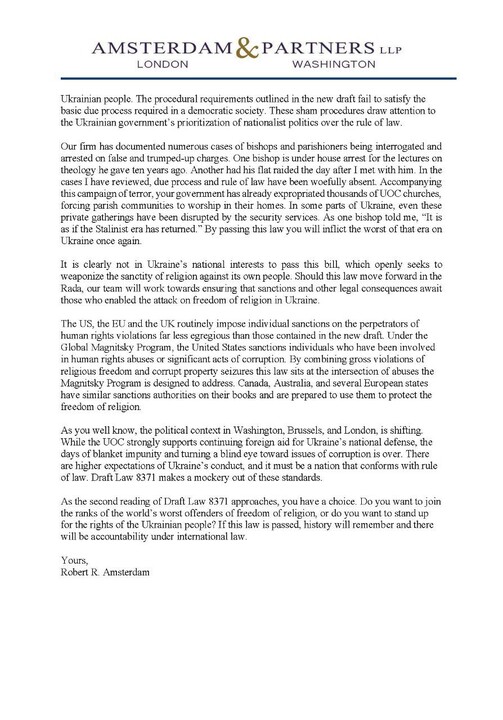 Robert Amsterdam concluded his letter saying, "As the second reading of Draft Law 8371 approaches, you face a choice. Do you want to join the ranks of the world's worst offenders of freedom of religion, or do you want to stand up for the rights of the Ukrainian people? If this law is passed, history will remember it, and there will be accountability under international law."