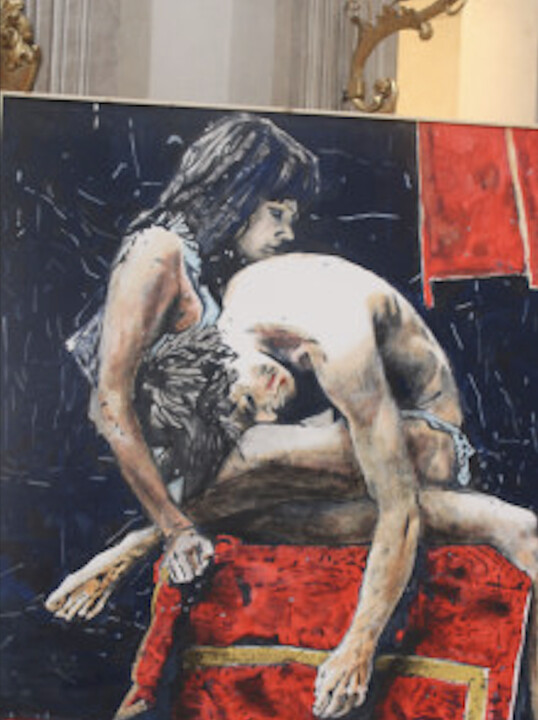 Another painting refers to Caravaggio's depiction of the Deposition of Christ from the Cross. In Saltini's interpretation, it appears as gay propaganda: a man held by several naked and semi-naked people, wearing a tight gay pride bodysuit and with hair dyed white.