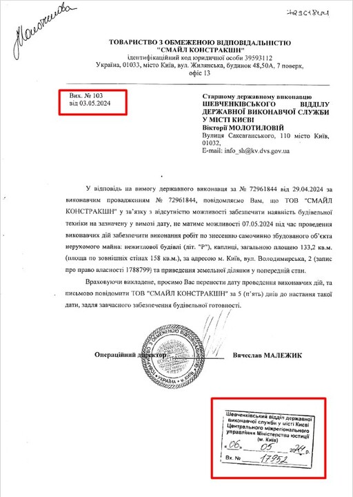 "That is, the letter stating that the construction company 'will not be able to carry out the work,' dated May 3, was entered into the system on May 6 in the afternoon. And only then could the lawyers of the Tithe Monastery learn about this decision," the statement said.