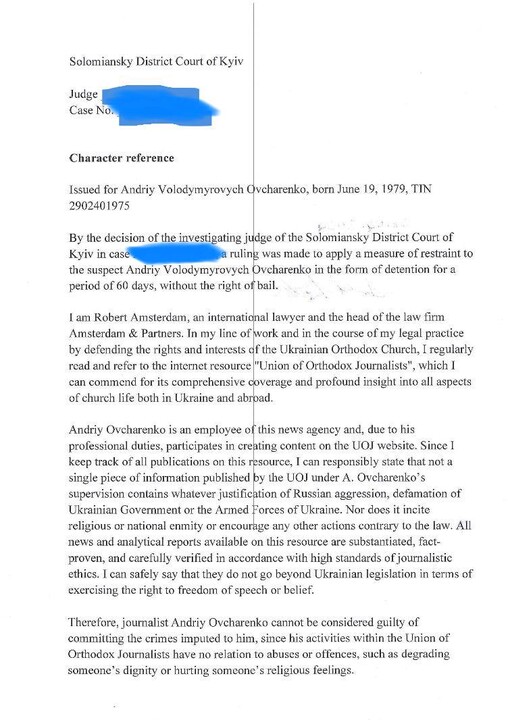 Robert Amsterdam noted that as part of his legal practice in defending the rights and interests of the Ukrainian Orthodox Church, he regularly reads the internet resource "Union of Orthodox Journalists".