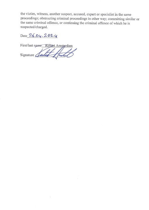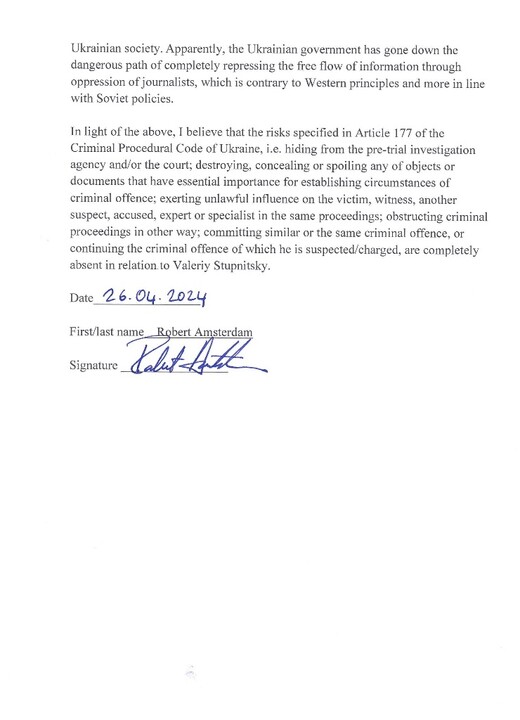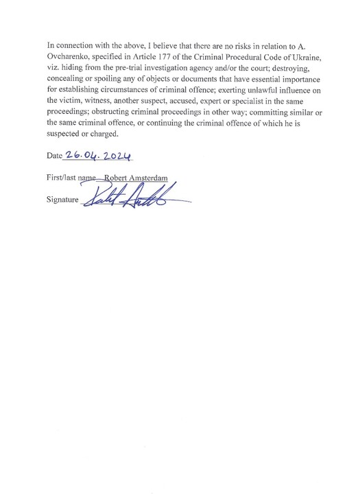 In light of the above, Robert Amsterdam believes that "the risks indicated in Article 177 of the Criminal Procedure Code of Ukraine for V. Bobechko, V. Stupnitsky, and A. Ovcharenko, namely: avoiding pre-trial investigation and court, destroying or hiding evidence, illegally influencing the victim, witness, another suspect, accused, expert, specialist in the same criminal proceedings, obstructing criminal proceedings, committing another criminal offense, or continuing the criminal offense in which they are suspected, are completely absent."