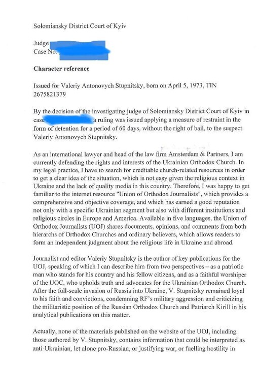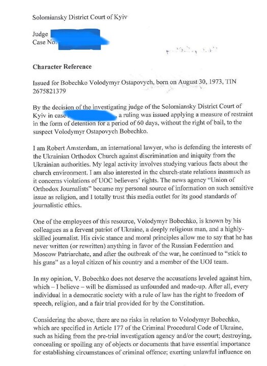 "His civic position and moral principles allow me to assert that, engaging in rewriting at the UOJ resourse, he never wrote anything in favor of the Russian Federation and the Moscow Patriarchate, and after the start of the war, he did not change his civic position," Amsterdam said.