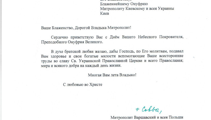 His Beatitude Metropolitan Savva of Warsaw and All Poland congratulated the Primate of the Ukrainian Orthodox Church, His Beatitude Metropolitan Onuphry of Kyiv and All Ukraine, on the day of his namesake.