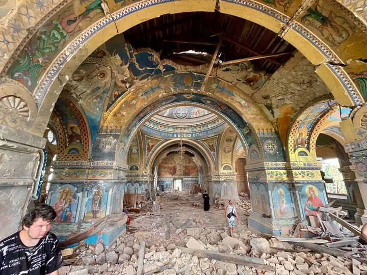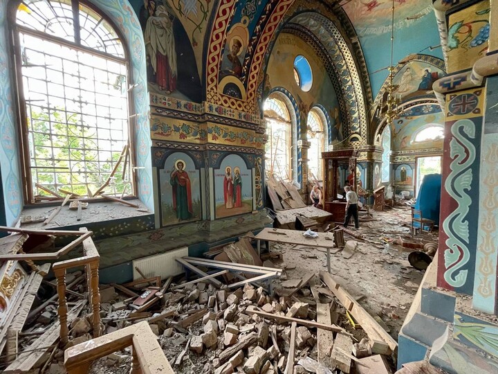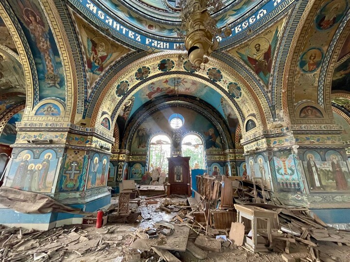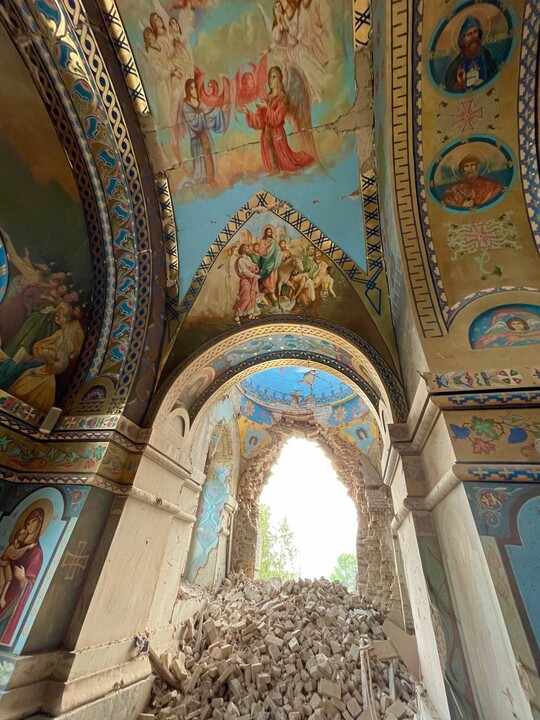 Photos posted on the Vicariate's Telegram channel show extensive damage to the church both inside and outside, with broken windows, destroyed walls, ceiling, and altar area.