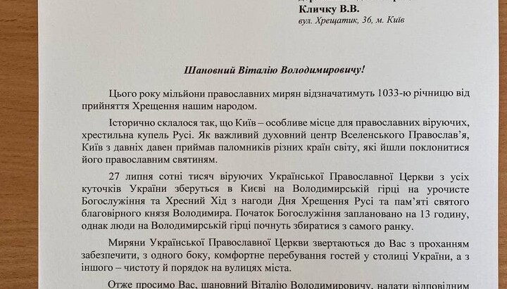 The “Miriane” division in Kyiv sent a request to the city mayor to assist in the preparation and conduct of the Cross Procession dedicated the Baptism of Rus holiday.