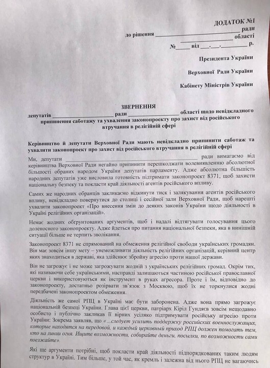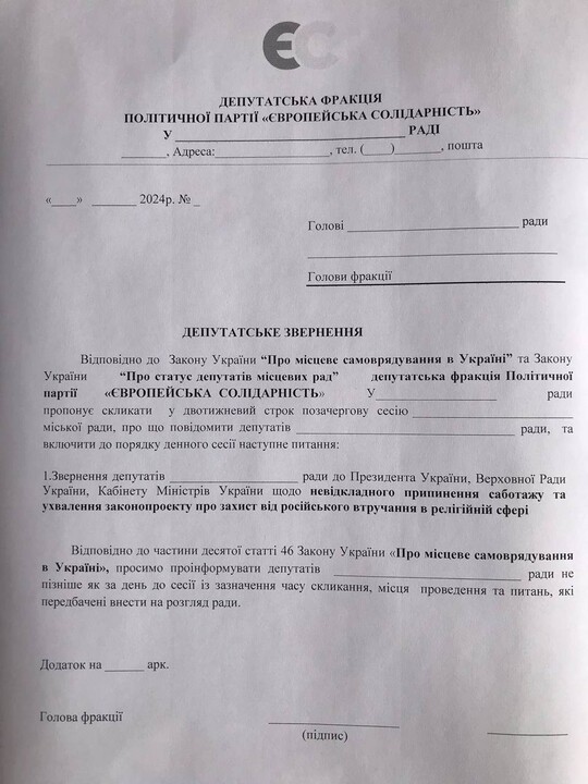 Local council deputies of the 'European Solidarity' faction are receiving letters with instructions on how to initiate extraordinary sessions at the local level, during which they are to consider an appeal to national MPs, demanding they vote for bill #8371, which effectively bans the UOC.