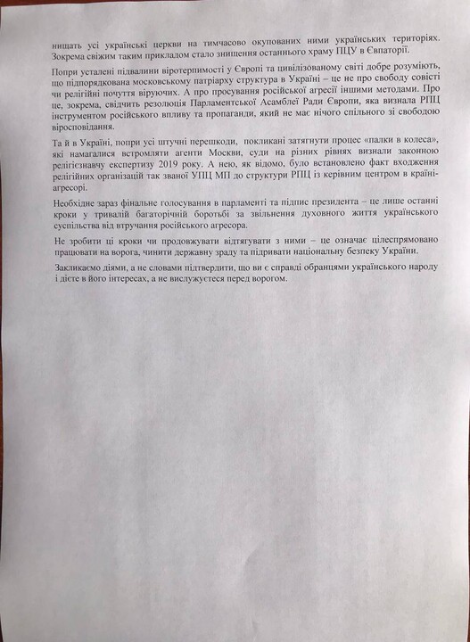 "The leadership and deputies of the Verkhovna Rada must immediately cease the sabotage and pass the bill to protect against Russian influence in the religious sphere," the appeal states.