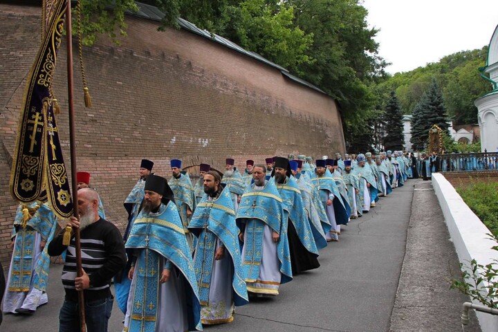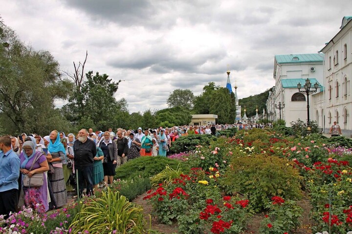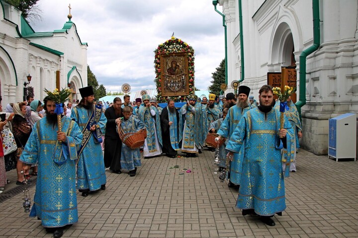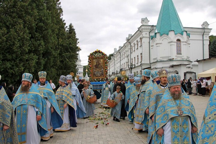 After the Liturgy, a procession was held with the miraculous Sviatohirsk Icon of the Mother of God. The clergy and faithful circled the holy Lavra, reading the Gospel and singing hymns. During the procession, the ringing of bells continued, and the Lavra clergy sprinkled holy water on the monastery and all the pilgrims.